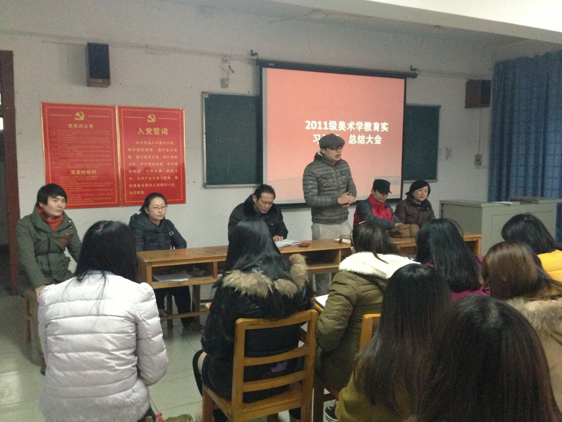 2014年12月25日上午,湖北第二师范学院艺术学院美术系2015届毕业生教育实习总结汇报大会在艺术学院9210举行。出席本次会议的领导有艺术学院党总支副书记张绍明、艺术学院副院长金波、美术系主任杨亚男、美术系副主任毛军、会议由美术系理论教研室主任韩莹莹老师主持。