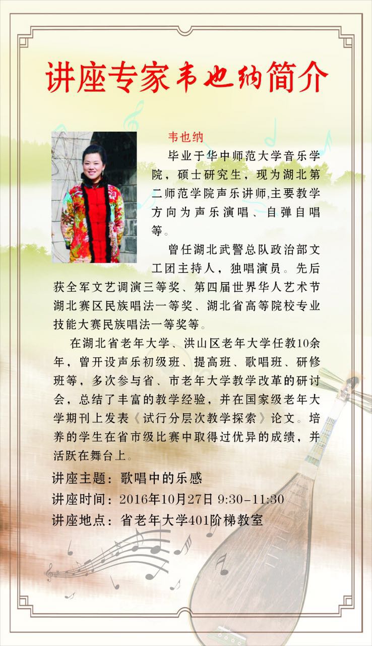 本网讯(通讯员 罗菲 原桂芳)2016年10月27日9点30分,艺术学院讲师韦也纳在省老年大学401阶梯教室举办了以“歌唱中的乐感”为主题的音乐讲座。