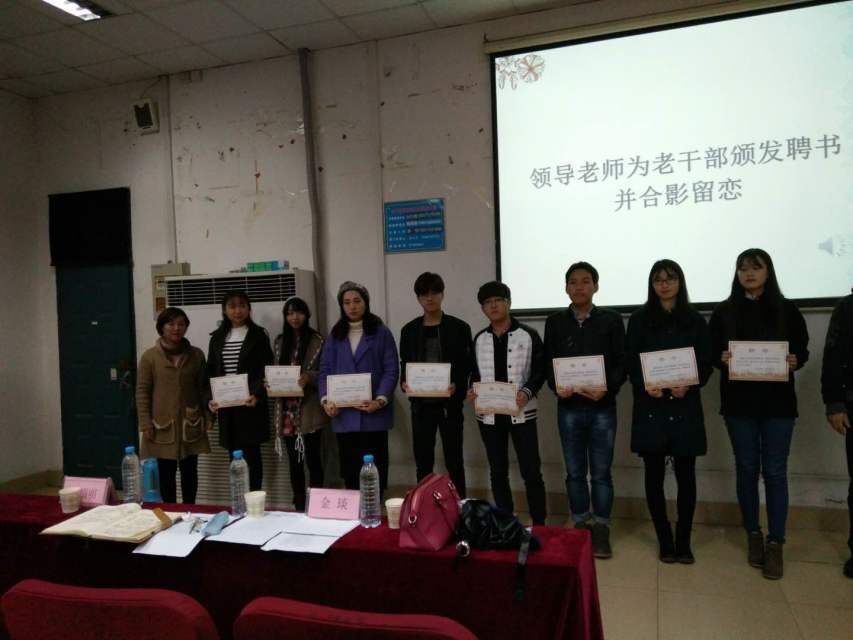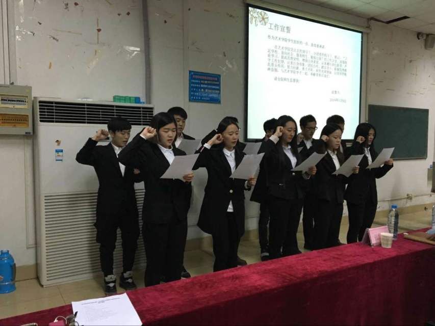 大会第一项为全体起立,奏唱共青团团歌。第二项由金琰老师宣读16届学生新晋干部任命通知,并表彰老一届学生干部。随后由领导老师为老一届干部颁发聘书并合影留念,接着由新晋学生会主席团干部们带领全体做工作宣誓。大会第三项由学术部新生干部代表唐雯发言。最后由张绍明书记致辞并宣布此次骨干培训大会开班典礼正式开始,由志愿者协会会长苏娜进行骨干公文培训。