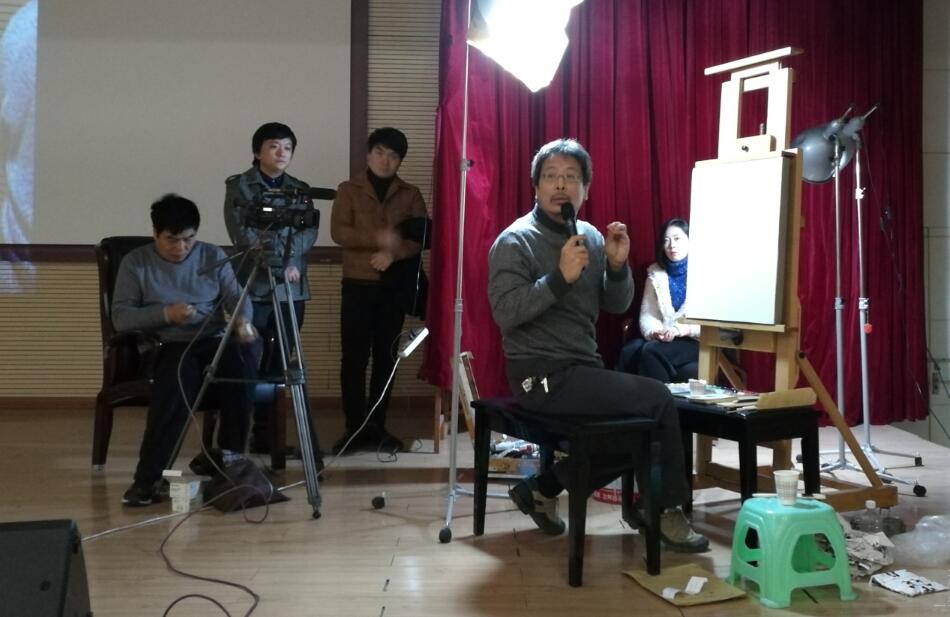 艺术学院常务副院长邵小孟主持讲座开幕仪式,学校副校长夏力教授对冷军先生的到来表示热烈的欢迎,并就冷军先生向同学们做了简要的介绍。他说:“冷军老师一直坚持在中国写实绘画领域的第一阵营,致力于中国当代写实绘画的发展,是后辈们学习和尊崇的国宝级大师。更令我们为之动容的是,冷军老师的敬业精神。他像一位满怀谦卑的传教者一般,将自己对艺术的理解知无不言地传授给现场在座的每一位艺术爱好者,传授给对艺术充满了炙热激情的每一位年轻人。”据了解冷军老师为当天的示范提前来到学校做了充分的准备。