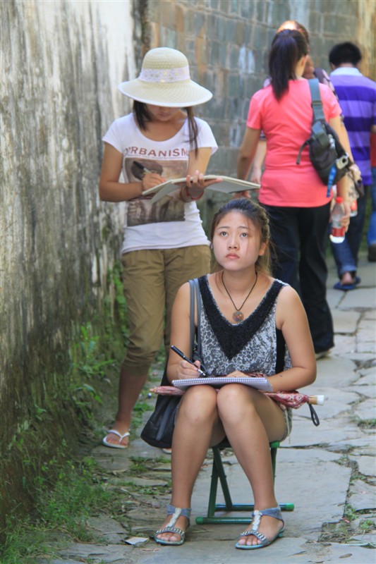 理坑的农民对写生的师生们非常热情,这里以一件小事可见一斑。我们在理坑看学生写生的一小院内遇到一位慈祥诙谐九十高龄的太婆。当大家把相机对准她和拿出画夹要速写她时,她笑着用当地话对大家说:“写生拍照,烟不可少。”开始我们听不懂,经导游翻译,我们急忙找来香烟递给她。她高兴地点燃烟大吸一口,然后摆好姿势对大家说:“好啦,可以开始了。”很遗憾,咱不抽烟,周围也没有卖烟的小铺子,不然,真应该送她老人家两盒烟。