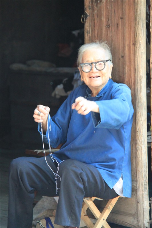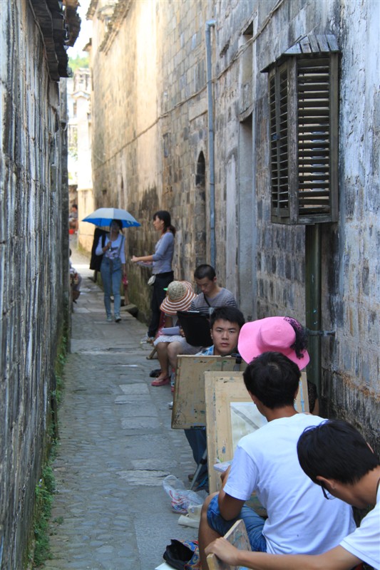 理坑的农民对写生的师生们非常热情,这里以一件小事可见一斑。我们在理坑看学生写生的一小院内遇到一位慈祥诙谐九十高龄的太婆。当大家把相机对准她和拿出画夹要速写她时,她笑着用当地话对大家说:“写生拍照,烟不可少。”开始我们听不懂,经导游翻译,我们急忙找来香烟递给她。她高兴地点燃烟大吸一口,然后摆好姿势对大家说:“好啦,可以开始了。”很遗憾,咱不抽烟,周围也没有卖烟的小铺子,不然,真应该送她老人家两盒烟。