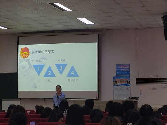 紧接着,骆夏君老师上台为大家进行思想教育,其中指出了要创建学习型、服务性、创新型学生组织以及学生组织重要的四点,即:凝聚力、执行力、归属感与团队意识。她强调,身为学生组织的一员,必须时刻谨记自己的职责与责任。