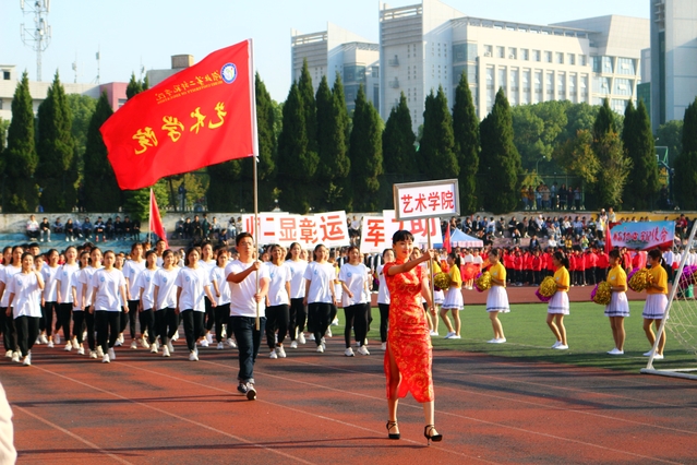 2019年10月31日,湖北第二师范学院于田径场举行2019年体育文化节暨秋季运动会。上午8点30分,运动会开幕式正式开始,各学院代表组成的方队纷纷走向主席台接受检阅,艺术学院的方队是由艺术学院参加第七届世界军人运动会的演职人员组成的,他们举着“助力军运彰显二师”的牌子昂首阔步走到主席台下方接受检阅。