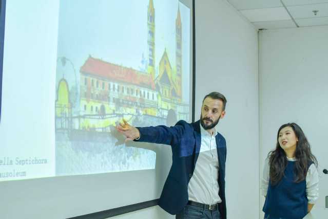 本场学术研讨的第一位嘉宾是来自湖北工业大学的教师Akos Hutter,他以《Fragments of historical and modern architecture in Pecs》(佩奇历史和现代建筑的片段)为题,为大家展现了匈牙利佩奇市佩奇大学建筑团队在参与设计保护佩奇市古代墓地博物馆的工作中,将墓室建造成地下博物馆的同时,通过设计玻璃穹顶的古墓博物馆游客中心完成了地下博物馆与地面传统建筑的交互,实现了旅游与城市文化功能的共融。