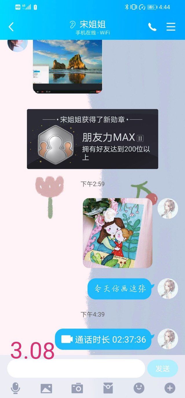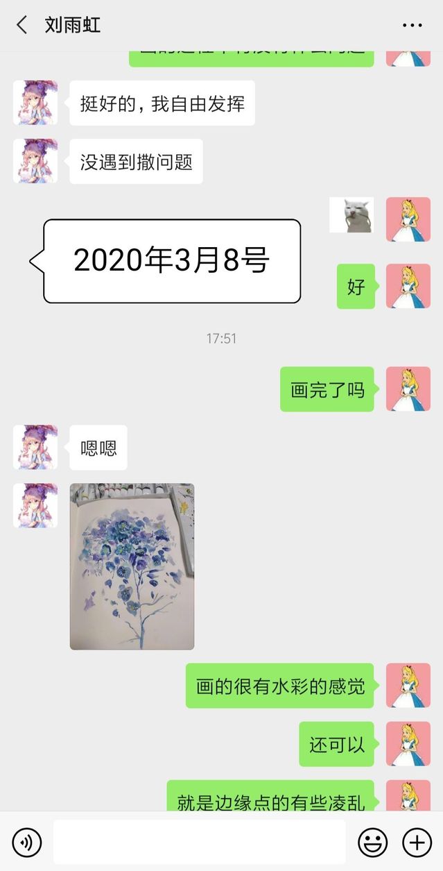 同样是19级的设计4班柴佳琦同学此次辅导的是一个五六岁的小朋友,在给小朋友上课的时候,她会通过分享屏幕的方式带着小朋友画,在教学过程中她尽量不去讲解理论知识,而是教她如何去欣赏美,小朋友的看到的世界和我们是不一样的,和小朋友一起从多个方面看问题,会发现很多有趣的事情,给小朋友讲课是一件很治愈的事情,自己在这个过程中也变得越来越温柔。