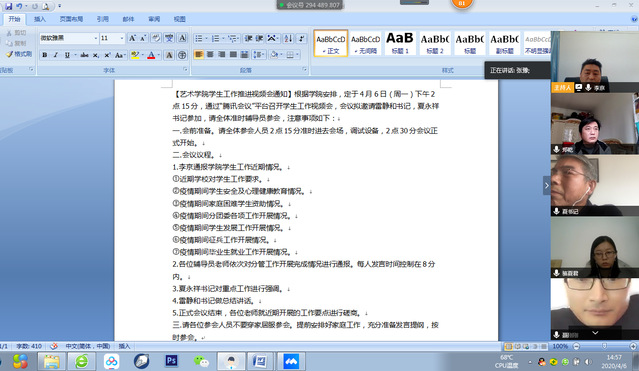 (本网讯 通讯员 李京)4月6日下午,艺术学院学生工作办公室组织召开学生工作推进网络视频会议,学院分党委书记、副书记、学生工作办公室主任、全体辅导员共9人参加了会议。会议由学工办主任李京主持。