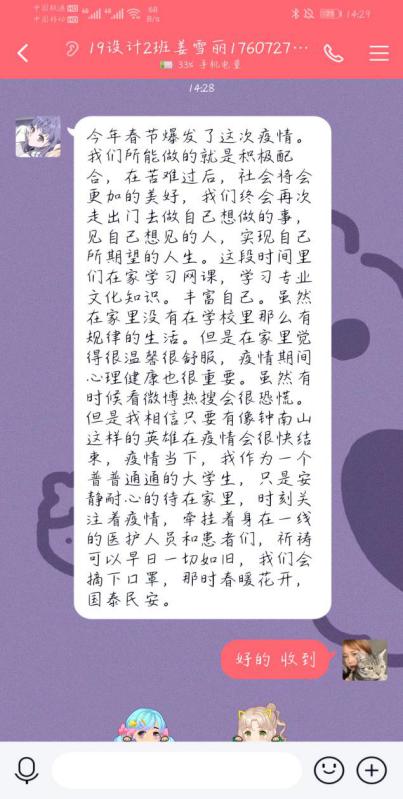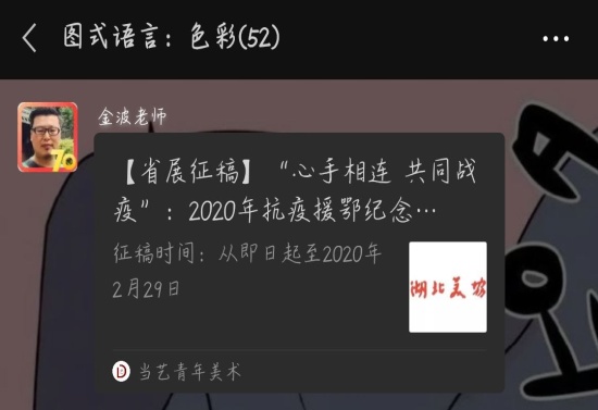 活动中,同学们在班群里积极发表自己对疫情期间的感想,分享疫情的小习惯,提供自我防护的小知识,团支书深刻总结同学们的发言,且分享一线抗疫人员的英雄事迹、激发大家的爱国情怀、与祖国共患难,做有担当的共青团员,其次同学们纷纷晒出为疫情做的贡献(绘画的作品、捐款、当志愿者等),最后金波院长带领我们为疫情设计的纪念章,展现艺术学院学子风采。