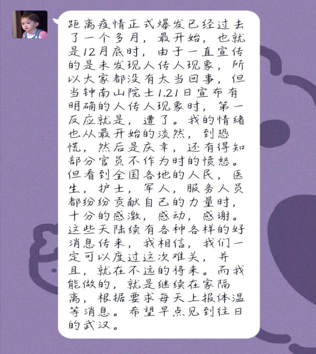 通过这次团日活动,同学们深入学习交流,大家一致相信,终究会战胜疫情,春暖花开。认为习近平总书记的重要讲话和一系列重要指示对疫情防控工作有着重大意义。这次团日活动丰富了同学们在疫情期间的文化生活,也增强了同学们疫情防控期间的责任意识,积极响应国家、学校号召,我们能做到坚决做到不造谣、不传谣、不信谣;没有学校通知,坚决不返校;按要求上报工作,配合所在地防控指挥部指挥。国有难,操戈披甲,人有危,众士争先。疫情就是命令,防控就是责任。在疫情面前不退缩,在困难面前不低头,关键时刻冲在前,这既是我们每一个中华儿女的责任,也是应尽的义务。相信只要我们坚定信心、全力以赴,就一定能打赢这场疫情阻击战!