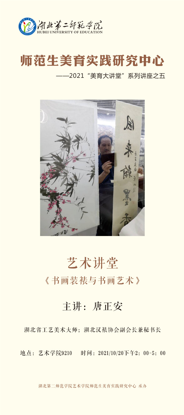 本网讯(通讯员 唐克石)2021年10月20日14:00—17:00由湖北二师师范生美育实践研究中心承办的2021“美育大讲堂”系列讲座之五《书画装裱与书画艺术》在艺术楼9210举行。本次讲座邀请湖北省工艺美术大师、武汉汉裱协会副会长兼秘书长唐正安大师担任主讲嘉宾,讲座面向艺术学院和全校学生开放。