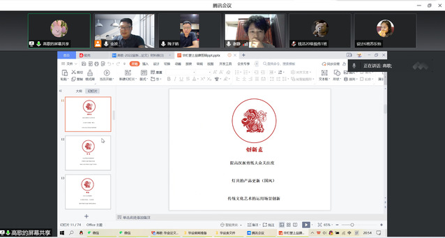 2022428日晚上20:00,艺术学院视觉传达设计系和美术系联合组织“互联网+”大学生创新创业大赛线上辅导会。艺术学院金波院长、企业导师隗子皓、谢静老师、张虎老师及三个团队参赛学生代表参加此次辅导会。