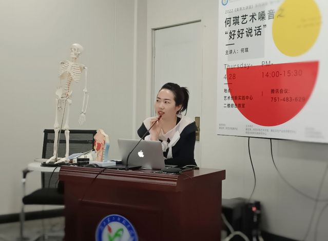 本网讯(记者 石佳璇聆听声音之美,感悟艺术生活。艺术学院于428日下午在艺术创新实践中心二楼综合教室开展了《何琪艺术嗓音之“好好说话”专题讲座由资深嗓音师何琪老师主讲。艺术学院《美育大讲堂》系列讲座是我校《大学美育》核心素养公共必修课的重要内容,本学期一千多人次通过现场与线上腾讯会议同步的方式参与了讲座。此次讲座是本学期的最后一讲,由艺术学院院长金波教授线上主持,大学美育教研室主任韩莹莹副教授及部分学生代表现场参与了讲座。