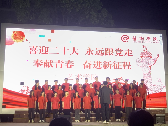 艺术学院代表队第十个上场,同学们有条不紊完成赛前准备,序地上场。第一首作品《光荣啊!中国共青团》情感表现丰富、形象鲜明,铿锵有力的音调,激昂奋进的爱国情感,生动地反映了共青团员们活泼可爱的生活气息。歌声或婉转,或激扬,或振奋,或高亢,艺术学院代表队的同学们高低声部配合默契,满含深情地演唱了这首歌曲。第二首作品《红旗飘飘》旋律深情激昂,让人热血沸腾。同学们采用混声四声部合唱的形式,将作品的情感演绎的淋漓尽致。表演完毕后,台下响起了热烈的掌声。经过激烈的角逐,艺术学院代表队最终斩获一等奖第一名。