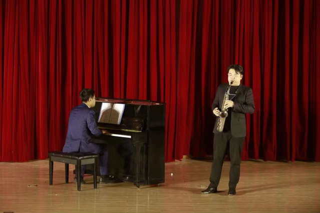 中场由特邀嘉宾音乐系钢琴教师寇琰带来一首李斯特的音乐会练习曲《叹息》,紧接着是萨克斯管教师杜寒枫和寇琰老师合作的一首《海鸥》,给音乐会增添了几分别样的色彩。