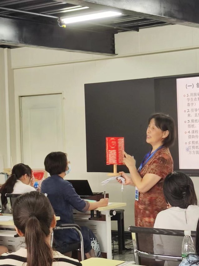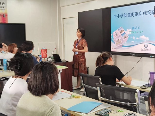 下午,由美术系陈元玉教授讲授中小学创意剪纸实践策略。陈老师教学经验丰富,首先面带笑容地为大家讲解了剪纸的概念和剪纸主要会用的几种方法。结合实际情况介绍了鄂州剪纸的辉煌历史:2009雕花剪纸,鄂州剪纸被联合国教科文组织列入人类口头与非物质文化遗产代表名录。接着展示了剪纸的构图特点:自由式构图、均衡式构图、双称式构图。剪纸的图案也往往和中国老百姓的生活息息相关,有着各种祝福、祛邪、吉祥的寓意,如荷花鸳鸯、百年好合寓意着甜美的爱情。令人印象深刻的是最后的创意剪纸环节,陈元玉老师运用多媒体技术给我们播放了很多关于创意剪纸的视频,让我们体会到艺术来源于生活而高于生活的理念。生活中许多很平常的不同类型的纸都可以用于艺术创作,例如平常我们剪纸用到的是金箔纸、瓦楞纸、植绒纸等等,但创新方式的理念提出之后还可以用到彩色打印纸或利用现有物件进行镂空或粘贴的方式来制作创意剪纸。陈老师给我们展示了很多她和学生利用扑克牌、衣服价牌、一次性盘子等材料做的剪纸作品,每件都是美轮美奂彰显着设计感。最后在陈元玉老师和蔼的微笑和亲切的话语中结束了今天的课程。