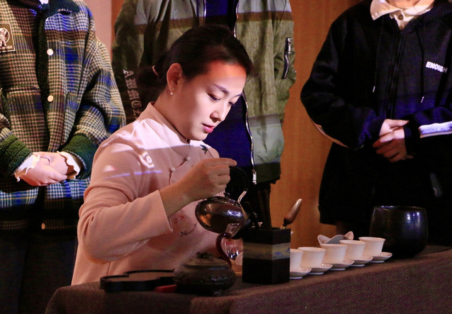 讲座中,为加强听众对茶文化的理解,韩莹莹还邀请了湖北省高级茶艺师何兢兢到现场进行了精彩的茶艺表演。茶艺师选茗、择水、展示茶具,随后烹茶,动作优雅端庄,一气呵成。“今天呈现的是一款云南古树红茶,闻香带着山野气息,春天的甜蜜尽显其中。在叶片灿烂的舒展下,也让香气里的内涵物质更好地释放。”韩莹莹讲解到。