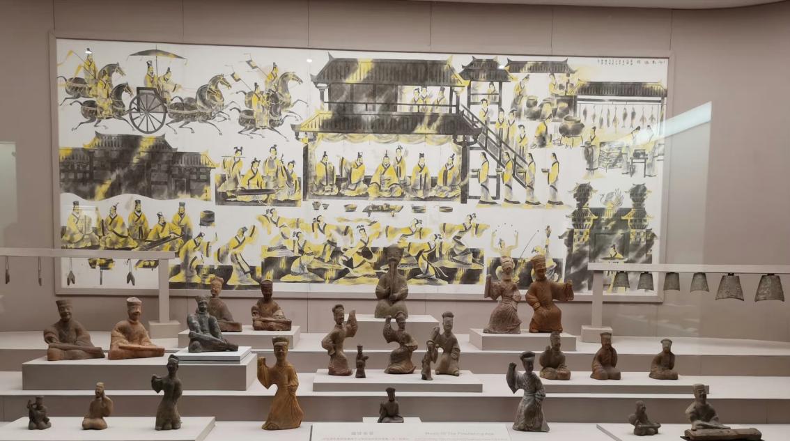 四川汉代陶石艺术馆二馆进门的屏风是一组陶塑,与后面背景合为一体,取名叫“盛世余音”。