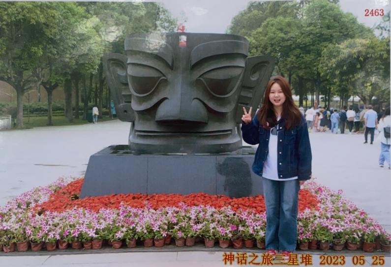 (图为学生与青铜面具塑像合影)