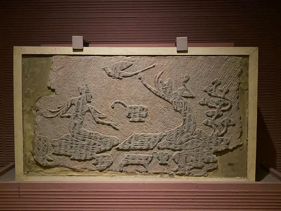 四川汉代陶石艺术馆二馆进门的屏风是一组陶塑,与后面背景合为一体,取名叫“盛世余音”。