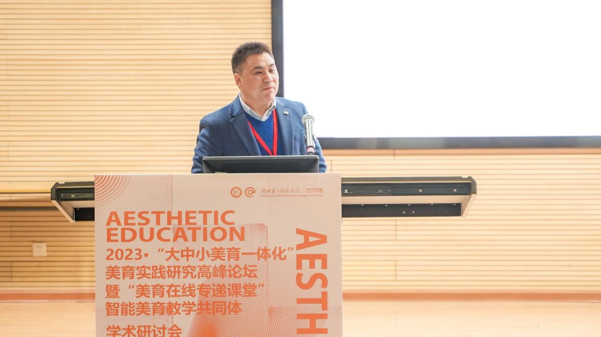 [通讯员 张川]2023年11月25日,2023·“大中小美育一体化”美育实践研究高峰论坛暨“美育在线专递课堂”智能美育教学共同体学术研讨会在湖北第二师范学院图书馆二号报告厅。武汉大学刘春阳教授做主题发言:美育四进案例分享。