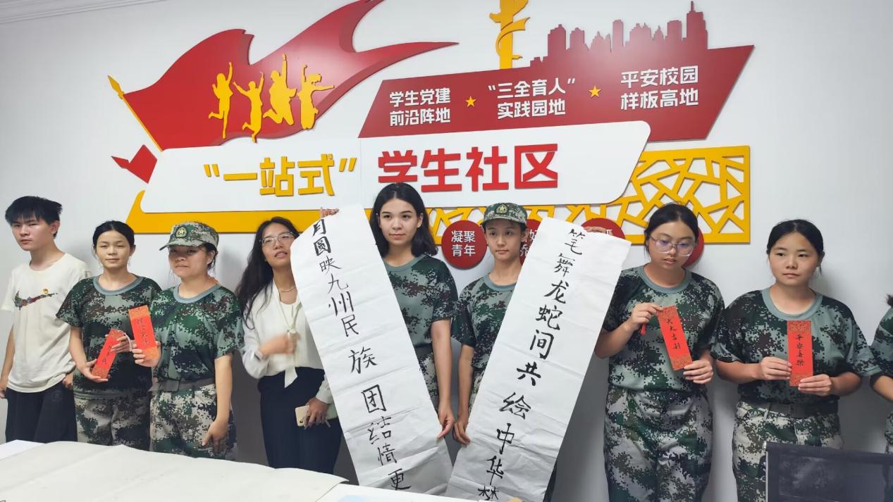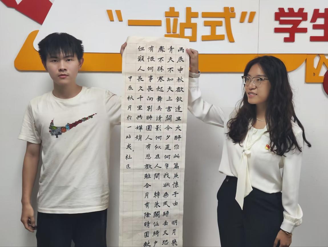 各民族同学围坐一起,在纸上共同书写寓意民族团结与中秋祝福的古诗词。每一段书写都由不同民族的同学接力完成,象征着各民族手挽手、心连心,共同绘制中华民族的美好蓝图。这一创意环节不仅展现了中华文化的多样性与统一性,也极大地促进了同学们之间的情感交流和文化认同。大家在交流诗词的同时,一起吃月饼话家常,欢声笑语弥漫在一站式学生社区活动中心。