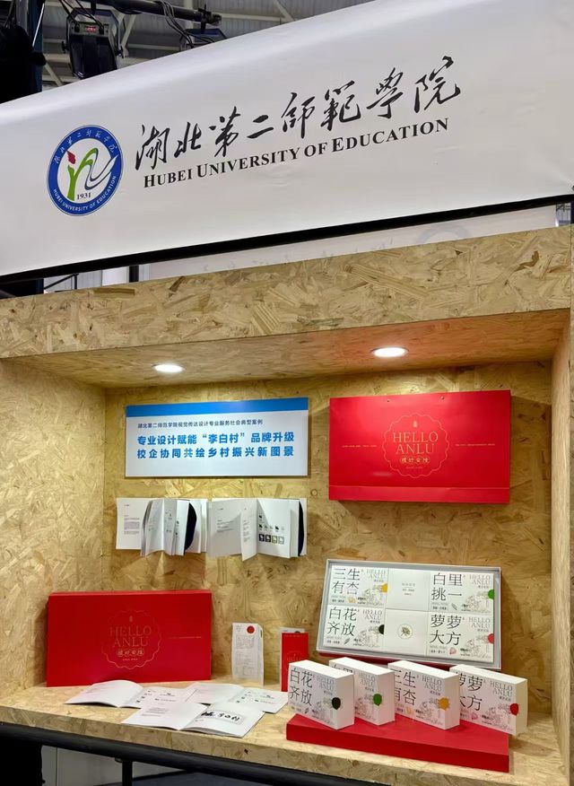 其中“设计教育创新成果展”荟萃江城创意智慧,集中了21所高校设计教育的丰硕成果,全面展示了武汉高等教育在设计领域的创新实力和育人成效。我校艺术学院视觉传达设计专业服务社会典型案例:设计赋能“李白村”品牌升级在此展出,项目由章倩书记、金波院长总指导,程蓉洁、曾显惠、叶建军作为指导老师带领学生团队完成。