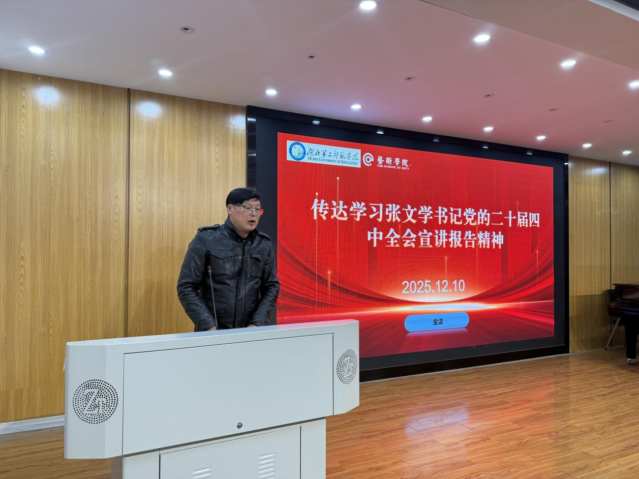 艺术学院院长金波领学张文学书记关于党的二十届四中全会精神的宣讲报告要点,引导教职工牢牢把握“十五五”时期教育发展的方向与使命,清醒认识研判学校发展面临的局势,推动教职工将张书记的报告精神转化为履职尽责、推动学院高质量发展的实际行动。